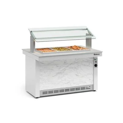 Mesa Térmica Aquecimento e exposição de alimentos Aquecimento: Banho maria através de resistência blindada Temperatura: +30° a +65°C Controle de Temperatura: Termostato Revestimento Interno: Base: Aço pré-pintado, saia e passagem de ar em aço revestido Revestimento Externo: Tanque: Aço Inox 304 Iluminação LED Pés niveladores Protetor salivar com ajuste de posição em vidro temperado Opcional: Cubas com puxadores e tampas Tampo em vidro com serigrafia Equipamento certificado conforme Portaria Inmetro nº 371/2009 Produto destinado para uso comercial * Imagens meramente ilustrativas. Imagens e informações sujeitas a alterações sem aviso prévio. ** Cores de acabamento e materiais sujeitos a variação de acordo com o lote de produção e/ou entre os materiais que compõem o produto (ex.: chapa, plástico,madeiras e etc.) Informações Técnicas Altura 1205mm Profundidade 1000mm Frente 1388mm Consumo 5,1kW/dia Peso Líquido 74kg Classe ( 4 )