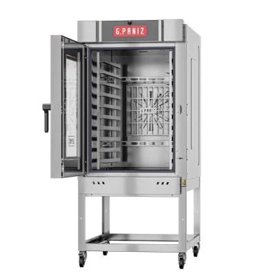 Indispensável em panificadoras e similares para assar pães, biscoitos, pizzas e outros, exceto produtos muito leves. Novos aspectos de maior robustez e acabamento. Painel digital na porta do forno. Porta com vidro duplo e vidro interno móvel para facilitar a limpeza. Testeira com acabamento em vidro temperado e serigrafado. Novo desenho de maçaneta, deixando a abertura mais suave. Capacidade para acomodar 10 esteiras. Câmara maior que proporciona assamento uniforme. Porta-esteiras ajustável em aço inox (comporta esteiras de 40 x 60, 45 x 70, 58 x 70 e 60 x 80). Consumo reduzido de gás/eletricidade por isolamento em lã de rocha de 75 mm. Vedação da porta em borracha 100% siliconada de fácil substituição. Rodízios reforçados para locomoção, sendo 2 com travas. Opção em epóxi branco ou total inox.