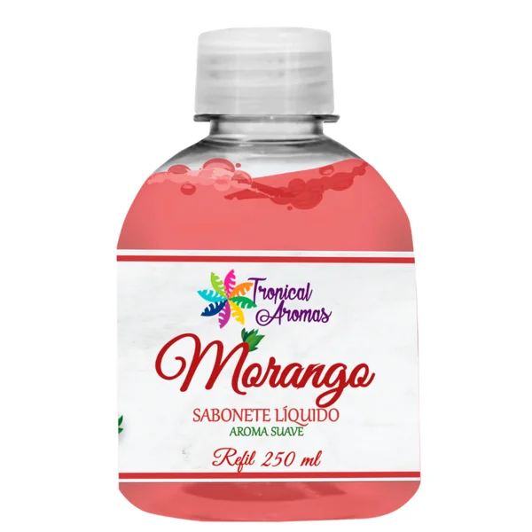 Refil Sabonete Líquido Morango 250ml - Tropical Aromas. Suave e hidratante o sabonete líquido Tropical Aromas Morango remove impurezas, suaviza o toque e deixa um perfume agradável na pele. O Sabonete líquido Tropical Aromas Morango possui pH fisiológico, o que permite uma limpeza sem ressecar. Seus ativos ainda ajudam na hidratação e proteção da pele para um toque sedoso mais duradouro. Tudo isso aliado a um aroma confortável e renovador. Como Usar: Aplique uma pequena quantidade de sabonete líquido diretamente sobre a pele ou em uma esponja de banho. Massageie o corpo, ou só as mãos, com movimentos circulares e enxágue. Para uma limpeza ideal da pele, é melhor caprichar na massagem do que usar uma quantidade alta de sabonete para evitar o desperdício. Quanto mais você espalhar com suavidade a fórmula pelo corpo, mais ela vai conseguir remover as impurezas profundamente.