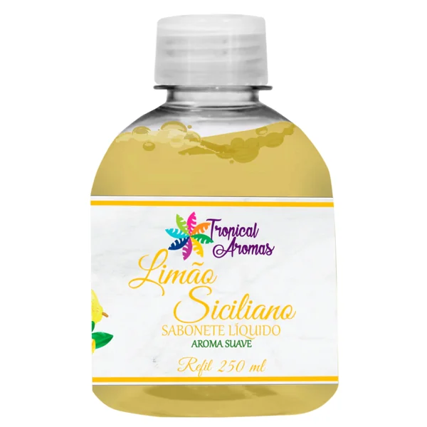 Refil Sabonete Líquido Limão Siciliano 250ml - Tropical Aromas Suave e hidratante o sabonete líquido Tropical Aromas Limão Siciliano remove impurezas, suaviza o toque e deixa um perfume agradável na pele. O Sabonete líquido Tropical Aromas Limão Siciliano possui pH fisiológico, o que permite uma limpeza sem ressecar. Seus ativos ainda ajudam na hidratação e proteção da pele para um toque sedoso mais duradouro. Tudo isso aliado a um aroma confortável e renovador. Como Usar: Aplique uma pequena quantidade de sabonete líquido diretamente sobre as mãos, com movimentos circulares e enxágue. Para uma limpeza ideal da pele, é melhor caprichar na massagem do que usar uma quantidade alta de sabonete para evitar o desperdício. Quanto mais você espalhar com suavidade a fórmula, mais ela vai conseguir remover as impurezas profundamente.