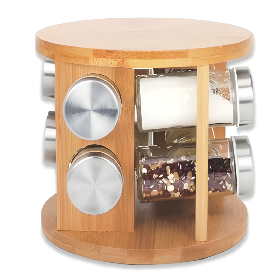 Quantidade/Caixa: 12 De bambu, vidro e plástico Na caixa | Giratório | Redondo Com 6 frascos | DIM: 16,5x13 cm